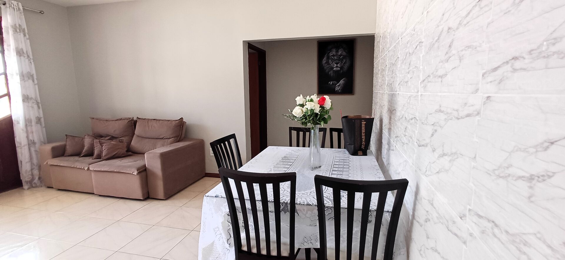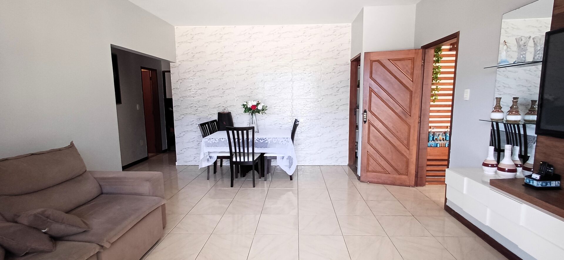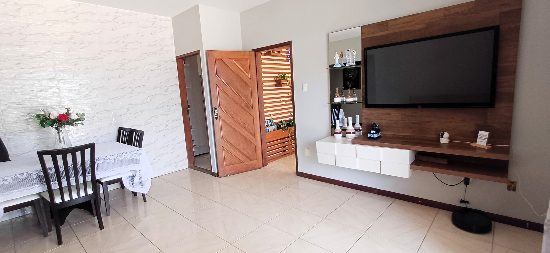 Subindo a escada, encontramos o primeiro pavimento com um hall, ampla sala em dois ambientes, tres quartos, sendo uma suíte, banheiro social, cozinha, área de serviço, banheiro de serviço. A sala dá acesso a um pátio itegrado com uma varanda gourmet.
